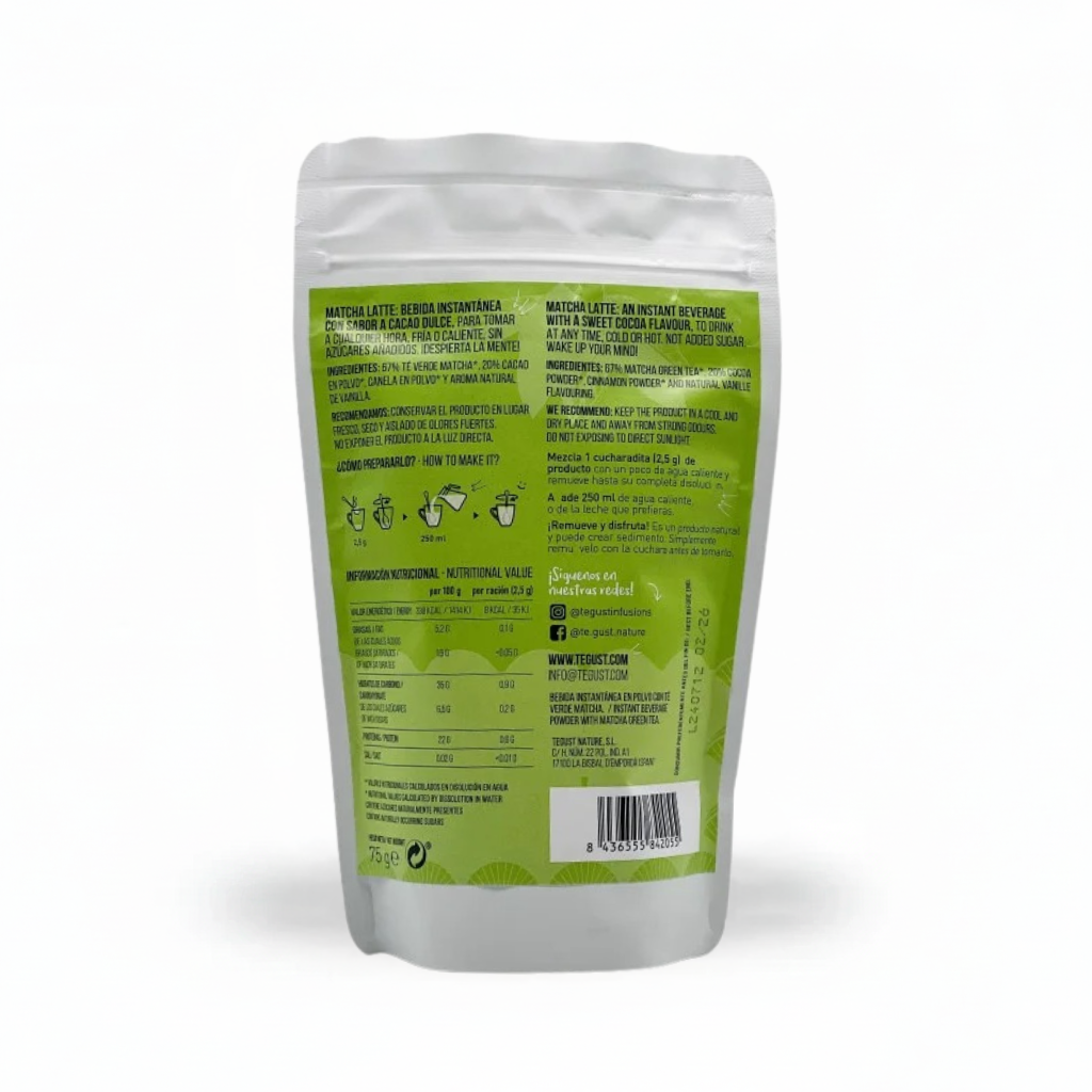67% Té verde matcha*, 20% de cacao en polvo*, canela en polvo*, aroma natural de vainilla.